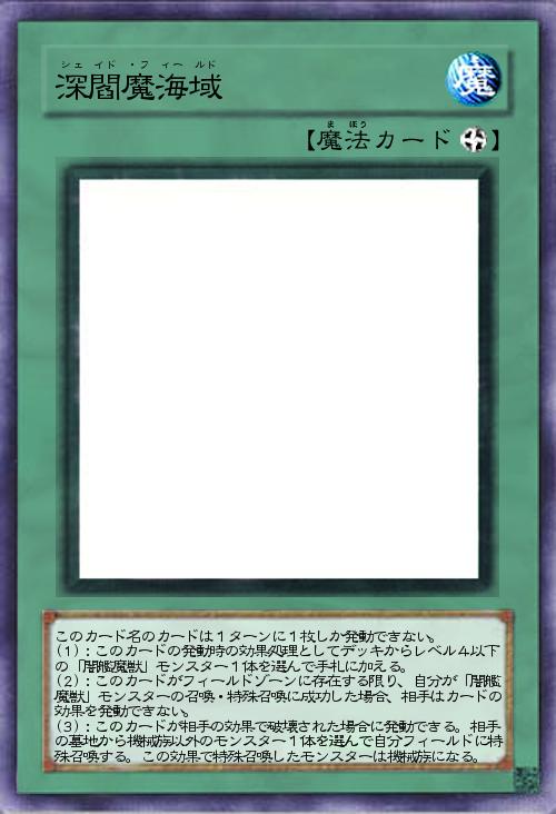 | このカード名のカードは1ターンに1枚しか発動できない。 (1):このカードの発動時の効果処理としてデッキからレベル4以下の「闇艦魔獣」モンスター1体を選んで手札に加える。 (2):このカードがフィールドゾーンに存在する限り、自分が「闇艦魔獣」モンスターの召喚・特殊召喚に成功した場合、相手はカードの効果を発動できない。 (3):このカードが相手の効果で破壊された場合に発動できる。相手の墓地から機械族以外のモンスター1体を選んで自分フィールドに特殊召喚する。この効果で特殊召喚したモンスターは機械族になる。 | |||