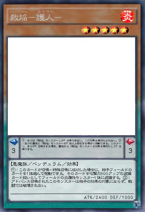 | ①:自分は「裁焔」モンスターしかP召喚できない。この効果は無効化されない。②:自分の墓地に「裁焔」モンスターが3体以上存在する場合に発動できる。このターン、自分がP召喚をする場合、墓地から「裁焔」モンスターを効果を無効にしてP召喚できる。 | |||