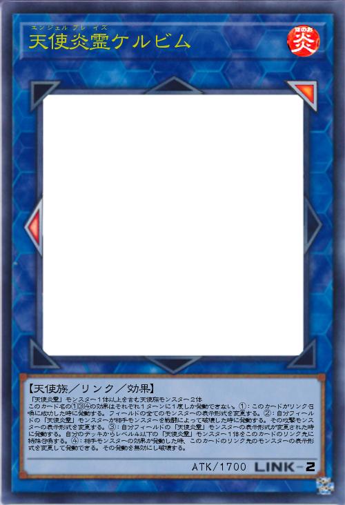 | 「天使炎霊」モンスター1体以上を含む天使族モンスター2体 このカード名の①③④の効果はそれぞれ1ターンに1度しか発動できない。①:このカードがリンク召喚に成功した時に発動する。フィールドの全てのモンスターの表示形式を変更する。②:自分フィールドの「天使炎霊」モンスターが相手モンスターを戦闘によって破壊した時に発動する。その攻撃モンスターの表示形式を変更する。③:自分フィールドの「天使炎霊」モンスターの表示形式が変更された時に発動する。自分のデッキからレベル4以下の「天使炎霊」モンスター1体をこのカードのリンク先に特殊召喚する。④:相手モンスターの効果が発動した時、このカードのリンク先のモンスターの表示形式を変更して発動できる。その発動を無効にし破壊する。 | |||