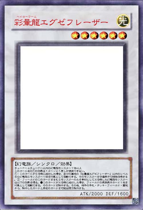 | チューナー+チューナー以外の幻竜族モンスター1体以上 このカード名の①の効果は1ターンに1度しか使用できない。 ①:このカードがS召喚に成功した場合、自分の墓地の「彩暈龍エグゼフレーザー」以外のレベル6の幻竜族Sモンスター1体を対象として発動できる。そのモンスターを守備表示で特殊召喚する。②:フィールドのこのカードを含むSモンスターのみを素材としてX召喚した幻竜族モンスターは以下の効果を得る。●このカードがX召喚に成功した場合、フィールドの表側表示カード1枚を対象として発動できる。そのカードを除外する。その後、相手の手札・デッキ・フィールド・墓地から、除外したカードと同名のカードを可能な限り除外する。 | |||