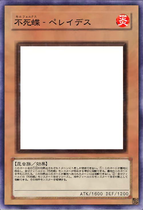 | このカード名の①②の効果はそれぞれ1ターンに1度しか使用できない。①:このカードが墓地に存在し、自分フィールドに「不死蝶」モンスターが存在する場合に発動できる。墓地のこのカードを手札に加える。この効果はこのカードが墓地へ送られたターンには発動できない。②:自分フィールドの「不死蝶」モンスター1体をリリースし、相手フィールドのモンスター1体を対象として発動できる。その相手モンスターを破壊する。 | |||