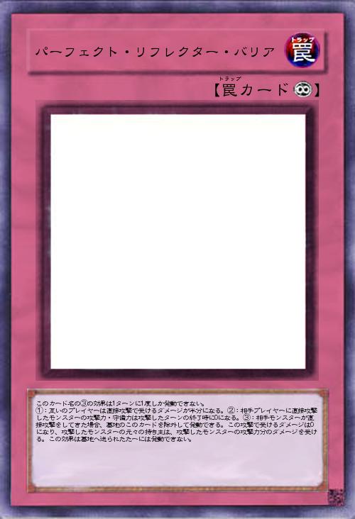 | このカード名の③の効果は1ターンに1度しか発動できない。 ①:互いのプレイヤーは直接攻撃で受けるダメージが半分になる。②:相手プレイヤーに直接攻撃したモンスターの攻撃力・守備力は攻撃したターンの終了時に0になる。③:相手モンスターが直接攻撃をしてきた場合、墓地のこのカードを除外して発動できる。この攻撃で受けるダメージは0になり、攻撃したモンスターの元々の持ち主は、攻撃したモンスターの攻撃力分のダメージを受ける。この効果は墓地へ送られたたーには発動できない。 | |||