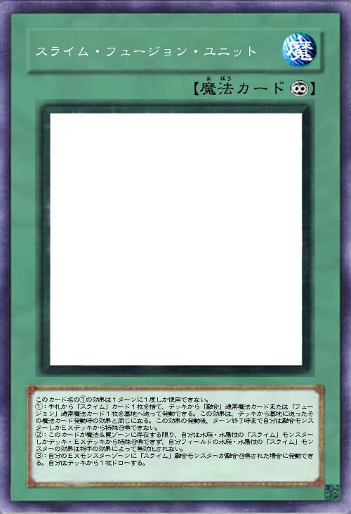 | このカード名の①の効果は1ターンに1度しか使用できない。 ①:手札から「スライム」カード1枚を捨て、デッキから「融合」通常魔法カードまたは「フュージョン」通常魔法カード1枚を墓地へ送って発動できる。この効果は、デッキから墓地に送ったその魔法カード発動時の効果と同じになる。この効果の発動後、ターン終了時まで自分は融合モンスターしかEXデッキから特殊召喚できない。 ②:このカードが魔法&罠ゾーンに存在する限り、自分は水族・水属性の「スライム」モンスターしかデッキ・EXデッキから特殊召喚できず、自分フィールドの水族・水属性の「スライム」モンスターの効果は相手の効果によって無効化されない。 ③:自分のEXモンスターゾーンに「スライム」融合モンスターが融合召喚された場合に発動できる。自分はデッキから1枚ドローする。 | |||