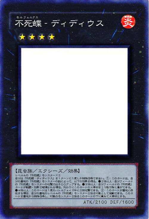 | レベル4の「不死蝶」モンスター×2 自分は「不死蝶‐ディディウス」を1ターンに1度しか特殊召喚できない。①:このカードは、自分の墓地の「不死蝶」モンスターの数によって、以下の効果を得る。●2体以上:自分フィールドの「不死蝶」モンスターの攻撃力は500アップする。●3体以上:自分フィールドの「不死蝶」カードが戦闘・効果で破壊される場合。代わりにこのカードのX素材を1つ取り除く事ができる。●4体以上:このカードは1度のバトルフェイズ中に2回攻撃できる。②:このカードが墓地に存在する場合、自分の墓地のレベル4の「不死蝶」モンスター2体を対象として発動できる。このカードを墓地から特殊召喚し、対象のモンスター2体をこのカードの下に重ねてX素材とする。 | |||