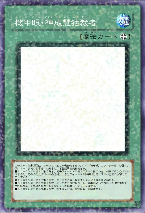 | このカード効果①②は1ターンに1度しか発動できない。①:「機甲眼」カウンターを1つ置く。②:1~4までの数字を1つ宣言し、下記効果を発動できる。 ●1:カウンターを1つ取り除き、相手フィールドのモンスター1体につき、相手に500ダメージを与え、その与えたダメージの合計分、自分フィールドの「機甲眼」モンスター全ての攻撃力がアップする。 ●2:カウンターを2つ取り除き、デッキからカードをランダムに1枚手札に加える。 ●3:カウンターを3つ取り除き、デッキから3枚ドローし、効果によって加わった「機甲眼」を手札に加え、それ以外のカードを全てデッキに戻し、シャッフルする。 ●4:カウンターを4つ取り除き、相手のLP分、自分のLPを回復する。 | |||