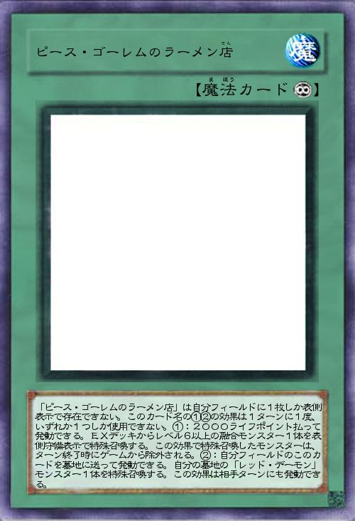 | 「ピース・ゴーレムのラーメン店」は自分フィールドに1枚しか表側表示で存在できない。このカード名の①②の効果は1ターンに1度、いずれか1つしか使用できない。①:2000ライフポイント払って発動できる。EXデッキからレベル6以上の融合モンスター1体を表側守備表示で特殊召喚する。この効果で特殊召喚したモンスターは、ターン終了時にゲームから除外される。②:自分フィールドのこのカードを墓地に送って発動できる。自分の墓地の「レッド・デーモン」モンスター1体を特殊召喚する。この効果は相手ターンにも発動できる。 | |||