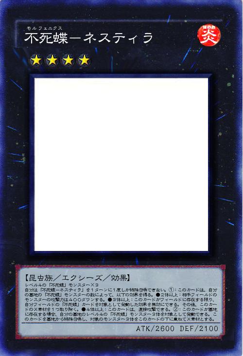 | レベル4の「不死蝶」モンスター×3 自分は「不死蝶-ネスティラ」を1ターンに1度しか特殊召喚できない。①:このカードは、自分の墓地の「不死蝶」モンスターの数によって、以下の効果を得る。●2体以上:相手フィールドのモンスターの攻撃力は400ダウンする。●3体以上:このカードがフィールドに存在する限り、自分フィールドの「不死蝶」カードを対象として発動した効果を無効にできる。その後、このカードのX素材を1つ取り除く。●4体以上:このカードは、直接攻撃できる。②:このカードが墓地に存在する場合、自分の墓地のレベル4の「不死蝶」モンスター3体を対象として発動できる。このカードを墓地から特殊召喚し、対象のモンスター3体をこのカードの下に重ねてX素材とする。 | |||