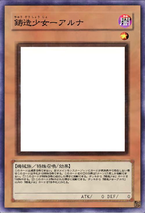 | このカードは通常召喚できない。自分メインモンスターゾーンにカードが表側表示で存在しない場合このカードは手札から特殊召喚できる。このカード名の②の効果は1ターンに1度しか発動できない。①:このカードが特殊召喚に成功した場合に発動できる。デッキから「鋳造少女」カードを1枚除外する。②:このカードが除外された場合に発動できる。デッキから「鋳造少女-アルマ」以外の「鋳造少女」カードを1体手札に加える。 | |||