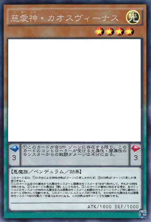 | このカード名の、①の方法による特殊召喚は1ターンに1度しか行えず、③の効果は1ターンに1度しか使用できない。 ①このカードは自分の墓地から光属性モンスターと闇属性モンスターを1体ずつ除外して、手札から特殊召喚できる。②このカードの属性は「闇」としても扱う。③このカードが墓地に存在する場合、自分フィールドのモンスターが相手の光属性または闇属性モンスターと戦闘を行うダメージステップ時に墓地のこのカードを除外して発動できる。このターンのバトルフェイズ終了時まで、その相手の光属性または闇属性モンスター1体の攻撃力・守備力は半分になる。この効果は相手ターンでも発動できる。 | |||