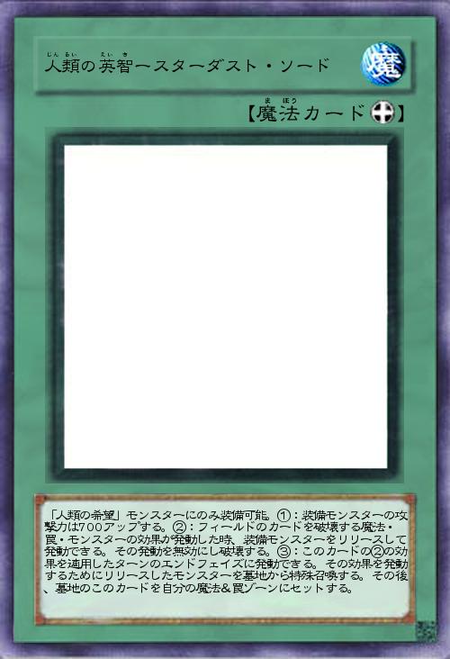 | 「人類の希望」モンスターにのみ装備可能。①:装備モンスターの攻撃力は700アップする。②:フィールドのカードを破壊する魔法・罠・モンスターの効果が発動した時、装備モンスターをリリースして発動できる。その発動を無効にし破壊する。③:このカードの②の効果を適用したターンのエンドフェイズに発動できる。その効果を発動するためにリリースしたモンスターを墓地から特殊召喚する。その後、墓地のこのカードを自分の魔法&罠ゾーンにセットする。 | |||