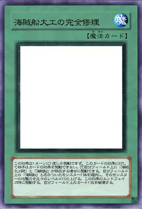 | この効果は1ターンに1度しか発動できず、このカードの効果に対して相手はカードの効果を発動できない。①自分フィールド上に「海賊大工師」と「海賊船」が存在する場合に発動できる。自分フィールド上の「海賊船」と名のついたモンスター1体を選択し、そのモンスターの攻撃力を元々のレベル×100上げる。この効果のエンドフェイズ時に発動する。自分フィールド上のカード1枚を破壊する。 | |||