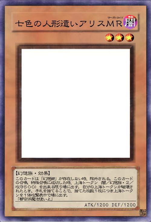 このカードは「幻想郷」が存在しない時、除外される。このカードの召喚、特殊召喚に成功した時、上海トークン(闇/幻想族・2/攻守500)を出来る限り場に出す。自分の上海トークンが破壊されたとき、手札を捨てることで、捨てた枚数1枚につき上海トークンを1体攻撃表示で場に出す。 「都会派魔法使いよ」 |