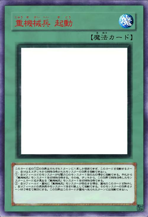 | このカード名の①②の効果はそれぞれ1ターンに1度しか使用できず、このカードを発動するターン、自分はEXデッキから特殊召喚されたモンスターの効果を発動できない。 ①:自分フィールドのモンスターが攻撃力0のモンスター1体のみの場合に発動できる。手札から「重機械兵」モンスター1体を特殊召喚する。その後、デッキから、この効果で特殊召喚したモンスターとカード名が異なる「重機械兵」モンスター1体を特殊召喚できる。 ②:自分フィールド・墓地に「重機械兵」モンスターが存在する場合、墓地のこのカードを除外し、自分フィールドの表側表示モンスター1体を対象として発動できる。そのモンスターの効果をターン終了時まで無効にする。この効果はこのカードが墓地へ送られたターンには発動できない。 | |||
