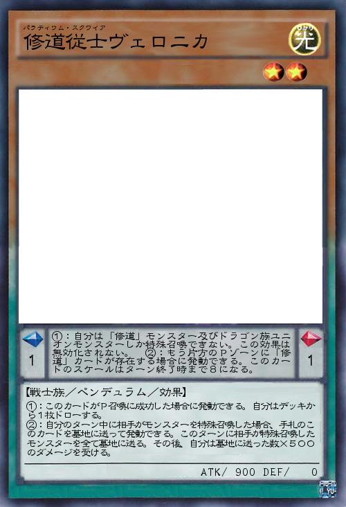 | ①:自分は「修道」モンスター及びドラゴン族ユニオンモンスターしか特殊召喚できない。この効果は無効化されない。 ②:もう片方のPゾーンに「修道」カードが存在する場合に発動できる。このカードのスケールはターン終了時まで8になる。 | |||
