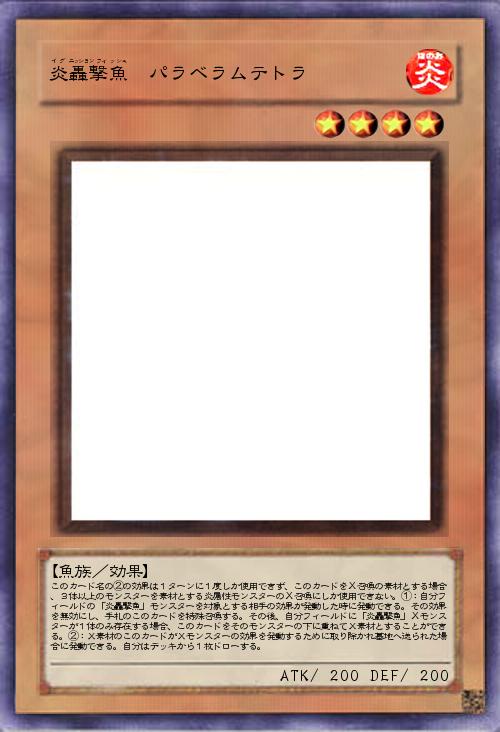 | このカード名の②の効果は1ターンに1度しか使用できず、このカードをⅩ召喚の素材とする場合、3体以上のモンスターを素材とする炎属性モンスターのⅩ召喚にしか使用できない。①:自分フィールドの「炎轟撃魚」モンスターを対象とする相手の効果が発動した時に発動できる。その効果を無効にし、手札のこのカードを特殊召喚する。その後、自分フィールドに「炎轟撃魚」Ⅹモンスターが1体のみ存在する場合、このカードをそのモンスターの下に重ねてX素材とすることができる。②:X素材のこのカードがXモンスターの効果を発動するために取り除かれ墓地へ送られた場合に発動できる。自分はデッキから1枚ドローする。 | |||