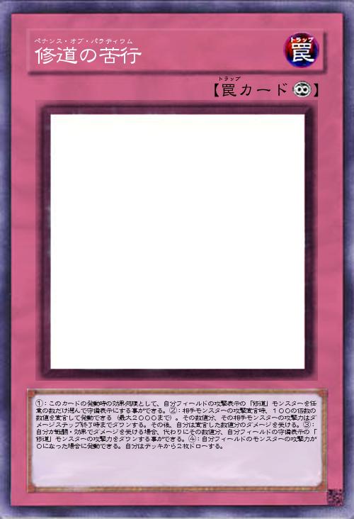 | ①:このカードの発動時の効果処理として、自分フィールドの攻撃表示の「修道」モンスターを任意の数だけ選んで守備表示にする事ができる。②:相手モンスターの攻撃宣言時、100の倍数の数値を宣言して発動できる(最大2000まで)。その数値分、その相手モンスターの攻撃力はダメージステップ終了時までダウンする。その後、自分は宣言した数値分のダメージを受ける。③:自分が戦闘・効果でダメージを受ける場合、代わりにその数値分、自分フィールドの守備表示の「修道」モンスターの攻撃力をダウンする事ができる。④:自分フィールドのモンスターの攻撃力が0になった場合に発動できる。自分はデッキから2枚ドローする。 | |||