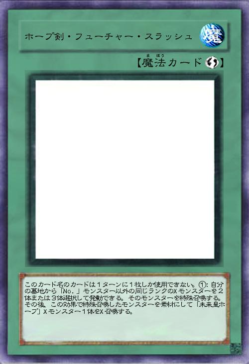 | このカード名のカードは1ターンに1枚しか使用できない。①:自分の墓地から「No.」モンスター以外の同じランクのXモンスターを2体または3体選択して発動できる。そのモンスターを特殊召喚する。その後、この効果で特殊召喚したモンスターを素材にして「未来皇ホープ」Xモンスター1体をX召喚する。 | |||