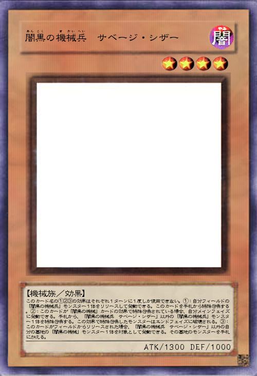 | このカード名の①②③の効果はそれぞれ1ターンに1度しか使用できない。①:自分フィールドの「闇黒の機械兵」モンスター1体をリリースして発動できる。このカードを手札から特殊召喚する。②:このカードが「闇黒の機械」カードの効果で特殊召喚されている場合、自分メインフェイズに発動できる。手札から、「闇黒の機械兵 サベージ・シザー」以外の「闇黒の機械兵」モンスター1体を特殊召喚する。この効果で特殊召喚したモンスターはエンドフェイズに破壊される。③:このカードがフィールドからリリースされた場合、「闇黒の機械兵 サベージ・シザー」以外の自分の墓地の「闇黒の機械」モンスター1体を対象として発動できる。その墓地のモンスターを手札に加える。 | |||