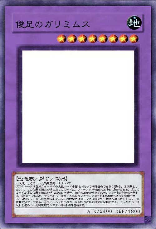 | 「俊足」と名のついた恐竜族モンスター×2 ①このカードは自分フィールドの上記カードを墓地へ送って特殊召喚できる(「融合」は必要としない)。この効果で特殊召喚したこのカードは、フィールドから離れた場合に除外される。②このカードが①の効果で特殊召喚に成功した場合、相手の墓地から相手はモンスター1体を特殊召喚する。③1ターンに1度、デッキから「俊足」と名のついたモンスター1体を墓地へ送って発動できる。自分フィールドの恐竜族モンスターの攻撃力はターン終了時まで、墓地へ送ったモンスターの攻撃力分アップする。④フィールドのこのカードが除外された場合に発動できる。デッキから「俊足」と名のついた恐竜族モンスター1体を特殊召喚する。 | |||