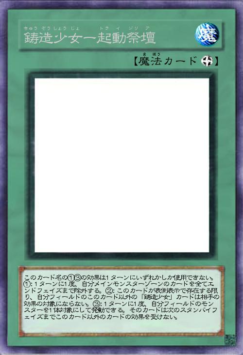 | このカード名の①③の効果は1ターンにいずれかしか使用できない。①:1ターンに1度、自分メインモンスターゾーンのカードを全てエンドフェイズまで除外する。②:このカードが表側表示で存在する限り、自分フィールドのこのカード以外の「鋳造少女」カードは相手の効果の対象にならない。③:1ターンに1度、自分フィールドのモンスターを1体対象にして発動できる。そのカードは次のスタンバイフェイズまでこのカード以外のカードの効果を受けない。 | |||