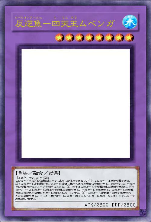 | 「反逆魚」モンスター×2体 このカード名の④の効果は1ターンに1度しか使用できない。①:このカードは直接攻撃できる。②:このカードが戦闘でモンスターを破壊し墓地へ送った場合に発動できる。そのモンスターの元々の攻撃力分のダメージを相手に与える。③:相手はこのカードを攻撃対象に選択できない。④:自分フィールドのカード3枚までを対象に発動できる。そのカードを破壊する。このカードの攻撃力はこの効果で破壊したカードの数×400アップする。⑤:このカードが戦闘・効果で破壊された時に発動できる。デッキ・墓地から「反逆魚ー四天王ムベンガ」以外の「反逆魚」モンスターを2体特殊召喚する。 | |||