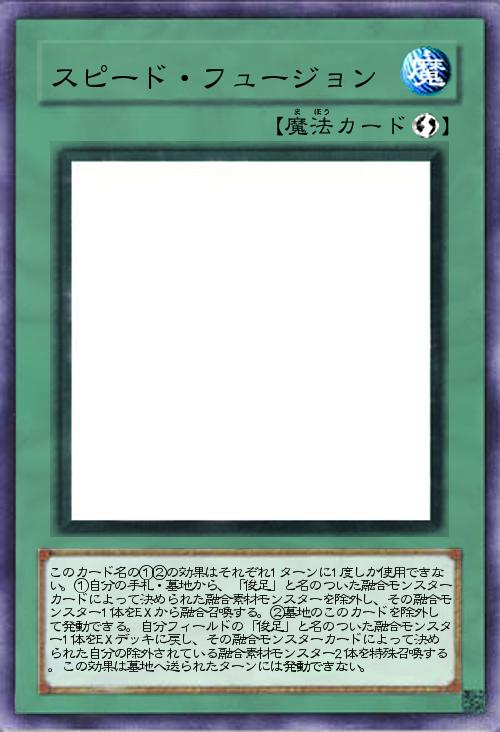 | このカード名の①②の効果はそれぞれ1ターンに1度しか使用できない。①自分の手札・墓地から、「俊足」と名のついた融合モンスターカードによって決められた融合素材モンスターを除外し、その融合モンスター1体をEXから融合召喚する。②墓地のこのカードを除外して発動できる。自分フィールドの「俊足」と名のついた融合モンスター1体をEXデッキに戻し、その融合モンスターカードによって決められた自分の除外されている融合素材モンスター2体を特殊召喚する。この効果は墓地へ送られたターンには発動できない。 | |||