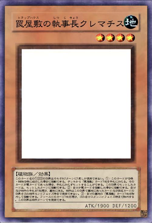 | このカード名の①②③の効果はそれぞれ1ターンに1度しか使用できない。①:このカードが召喚・特殊召喚に成功した場合に発動できる。デッキから「罠屋敷」カード1枚を手札に加える。そのカードが罠カードであった場合、手札に加えずセットすることができる。この効果でセットしたカードは、セットしたターンに発動できる。②:自分が罠カードを発動した場合に発動できる。自分及び相手の手札を1枚選び、墓地に送る。相手はこの効果で墓地に送ったカード及び同名カードの効果を次の相手エンドフェイズ時まで使用できない。③:自分の墓地の「罠屋敷」カード1枚を除外して発動できる。フィールドのカード1枚を選び、次の自分スタンバイフェイズ時まで除外する。この効果は相手ターンでも使用できる。 | |||