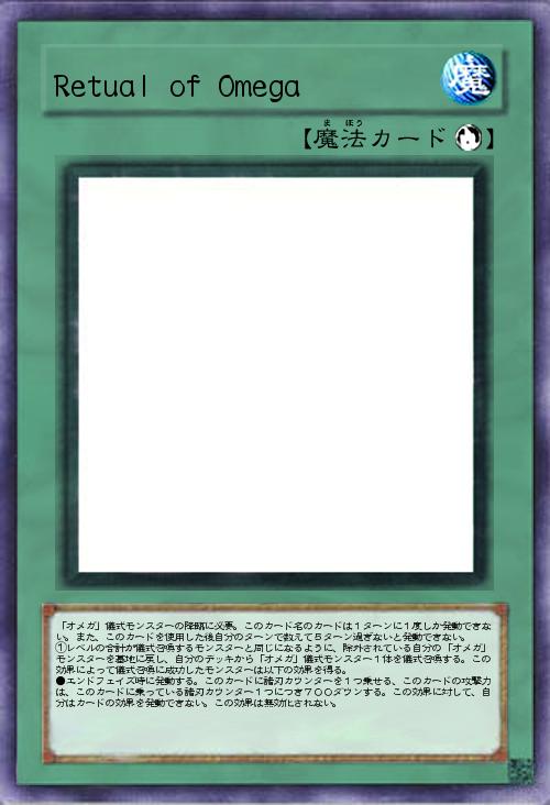 | 「オメガ」儀式モンスターの降臨に必要。このカード名のカードは1ターンに1度しか発動できない。また、このカードを使用した後自分のターンで数えて5ターン過ぎないと発動できない。 ①レベルの合計が儀式召喚するモンスターと同じになるように、除外されている自分の「オメガ」モンスターを墓地に戻し、自分のデッキから「オメガ」儀式モンスター1体を儀式召喚する。この効果によって儀式召喚に成功したモンスターは以下の効果を得る。 ●エンドフェイズ時に発動する。このカードに諸刃カウンターを1つ乗せる、このカードの攻撃力は、このカードに乗っている諸刃カウンター1つにつき700ダウンする。この効果に対して、自分はカードの効果を発動できない。この効果は無効化されない。 | |||