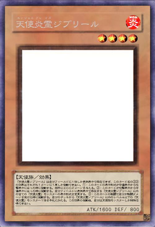 | 「天使炎霊ジブリール」は自分フィールドに1体しか表側表示で存在できず、このカード名の②③の効果はそれぞれ1ターンに1度しか発動できない。①:このカードの表示形式が守備表示から攻撃表示になった時に発動する。相手に200ダメージを与える。②:このカードが攻撃表示から守備表示になった時に発動する。自分フィールドに表側表示で存在する「天使炎霊ジブリール」以外の全ての「天使炎霊」モンスターの表示形式を変更する。③:このカードの戦闘で自分が戦闘ダメージを受けた時に発動する。自分のデッキから「天使炎霊ジブリール」以外のレベル4以下の「天使炎霊」モンスター1体を手札に加える。この効果の発動後、自分は天使族モンスターしか特殊召喚できない。 | |||