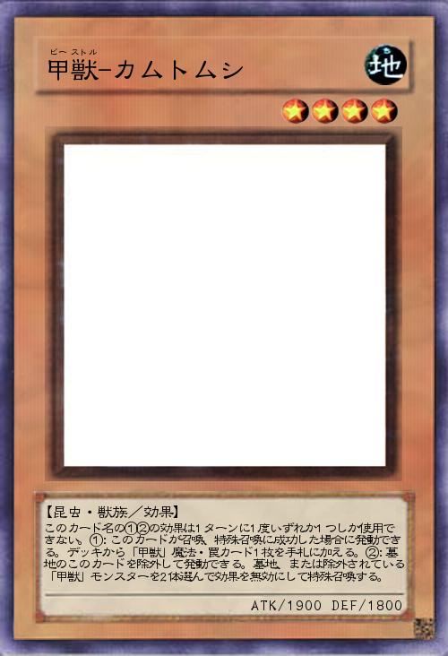 | このカード名の①②の効果は1ターンに1度いずれか1つしか使用できない。①:このカードが召喚、特殊召喚に成功した場合に発動できる。デッキから「甲獣」魔法・罠カード1枚を手札に加える。②:墓地のこのカードを除外して発動できる。墓地、または除外されている「甲獣」モンスターを2体選んで効果を無効にして特殊召喚する。 | |||