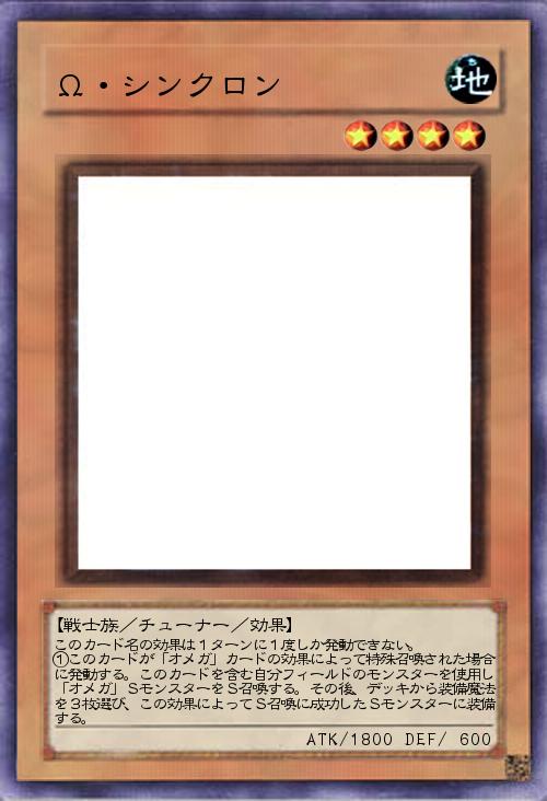 | このカード名の効果は1ターンに1度しか発動できない。 ①このカードが「オメガ」カードの効果によって特殊召喚された場合に発動する。このカードを含む自分フィールドのモンスターを使用し「オメガ」SモンスターをS召喚する。その後、デッキから装備魔法を3枚選び、この効果によってS召喚に成功したSモンスターに装備する。 | |||