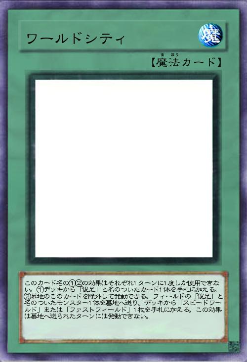 | このカード名の①②の効果はそれぞれ1ターンに1度しか使用できない。①デッキから「俊足」と名のついたカード1体を手札に加える。②墓地のこのカードを除外して発動できる。フィールドの「俊足」と名のついたモンスター1体を墓地へ送り、デッキから「スピードワールド」または「ファストフィールド」1枚を手札に加える。この効果は墓地へ送られたターンには発動できない。 | |||