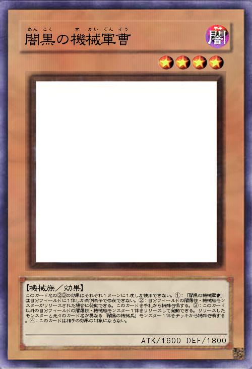 | このカード名の②③の効果はそれぞれ1ターンに1度しか使用できない。①:「闇黒の機械軍曹」は自分フィールドに1体しか表側表示で存在できない。②:自分フィールドの闇属性・機械族モンスターがリリースされた場合に発動できる。このカードを手札から特殊召喚する。③:このカード以外の自分フィールドの闇属性・機械族モンスター1体をリリースして発動できる。リリースしたモンスターと元々のカード名が異なる「闇黒の機械兵」モンスター1体をデッキから特殊召喚する。④:このカードは相手の効果の対象にならない。 | |||