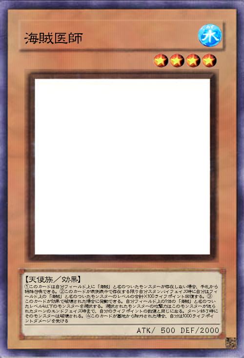 | ①このカードは自分フィールド上に「海賊」と名のついたモンスターが存在しない場合、手札から特殊召喚できる。②このカードが表側表示で存在する限り自分スタンバイフェイズ時に自分はフィールド上の「海賊」と名のついたモンスターのレベルの合計×100ライフポイント回復する。③このカードが効果で破壊された場合に発動できる。自分フィールド上の1体の「海賊」と名のついたレベル4以下のモンスターを選択する。選択されたモンスターの攻撃力はこのモンスターが送られたターンのエンドフェイズ時まで、自分のライフポイントの数値と同じになる。ターン終了時にそのモンスターは破壊される。④このカードが墓地から除外された場合、自分は1000ライフポイントダメージを受ける | |||