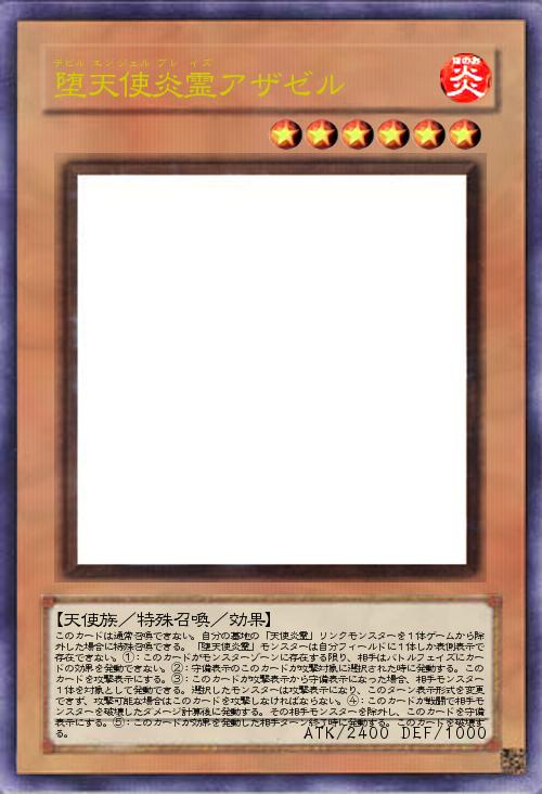 「「天使炎霊」の16枚目で、「堕天使炎霊」の1枚目ともなるモンスターです。昨日作ったカードですが、わかりにくいテキストと今後「堕天使炎霊」を増やす時のための設定付けの為に作り直しを行いました。「堕天使炎霊」は「天使炎霊」の中でも破壊力の高いカード群にする予定です。そのかわり「堕天使炎霊」モンスターは自分フィールドに1体しか存在できず、効果を発動した場合に自壊する効果を持ちます。効果を欲張りすぎたせいでテキスト枠を大きくはみ出してしまいました。
