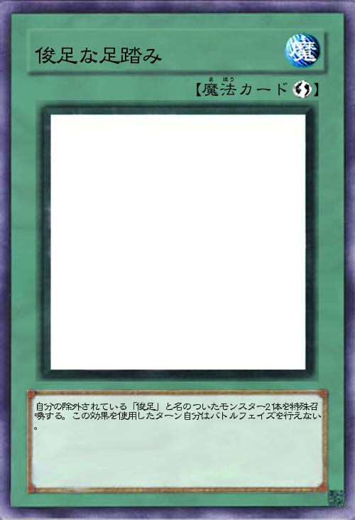 | 自分の除外されている「俊足」と名のついたモンスター2体を特殊召喚する。この効果を使用したターン自分はバトルフェイズを行えない。 | |||