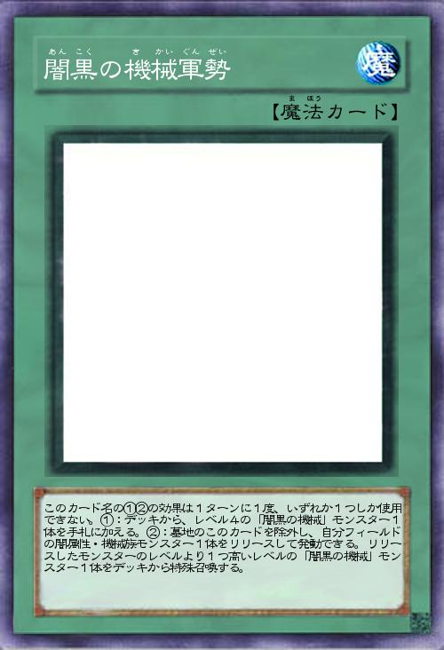 | このカード名の①②の効果は1ターンに1度、いずれか1つしか使用できない。①:デッキから、レベル4の「闇黒の機械」モンスター1体を手札に加える。②:墓地のこのカードを除外し、自分フィールドの闇属性・機械族モンスター1体をリリースして発動できる。リリースしたモンスターのレベルより1つ高いレベルの「闇黒の機械」モンスター1体をデッキから特殊召喚する。 | |||