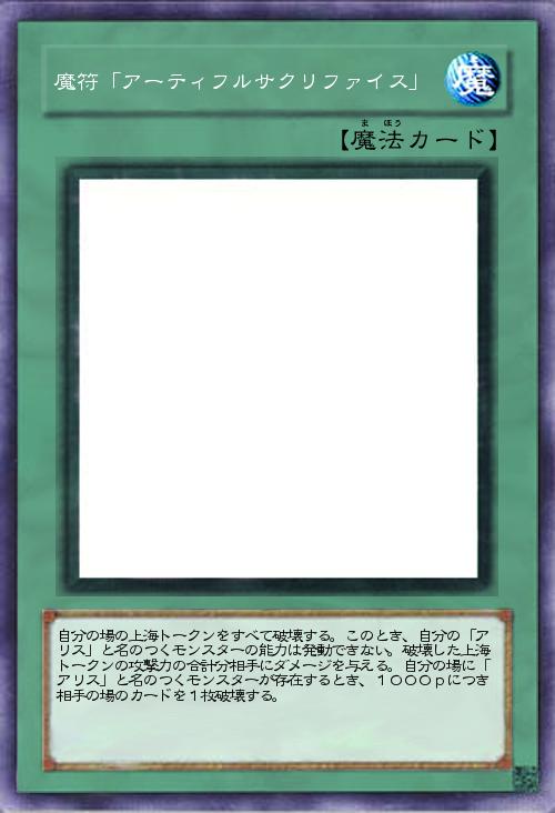 | 自分の場の上海トークンをすべて破壊する。このとき、自分の「アリス」と名のつくモンスターの能力は発動できない。破壊した上海トークンの攻撃力の合計分相手にダメージを与える。自分の場に「アリス」と名のつくモンスターが存在するとき、1000pにつき相手の場のカードを1枚破壊する。 | |||