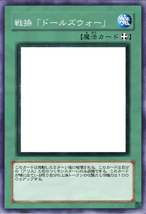 | このカードは発動した5ターン後に破壊される。このカードは自分の「アリス」と名のつくモンスターにのみ装備できる。このカードが場に出ている限り自分の上海トークンの攻撃力と守備力は1000pアップする。 | |||
