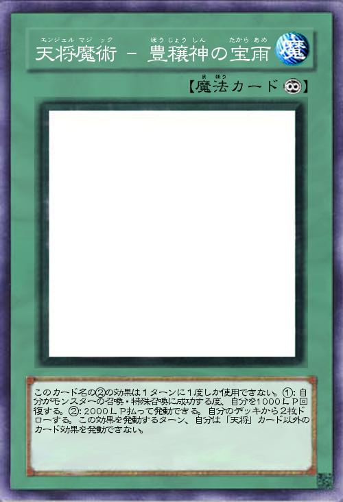 | このカード名の②の効果は1ターンに1度しか使用できない。①:自分がモンスターの召喚・特殊召喚に成功する度、自分を1000LP回復する。②:2000LP払って発動できる。自分のデッキから2枚ドローする。この効果を発動するターン、自分は「天将」カード以外のカード効果を発動できない。 | |||