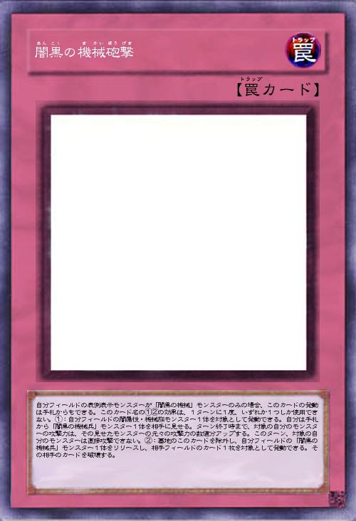 | 自分フィールドの表側表示モンスターが「闇黒の機械」モンスターのみの場合、このカードの発動は手札からもできる。このカード名の①②の効果は、1ターンに1度、いずれか1つしか使用できない。①:自分フィールドの闇属性・機械族モンスター1体を対象として発動できる。自分は手札から「闇黒の機械兵」モンスター1体を相手に見せる。ターン終了時まで、対象の自分のモンスターの攻撃力は、その見せたモンスターの元々の攻撃力の数値分アップする。このターン、対象の自分のモンスターは直接攻撃できない。②:墓地のこのカードを除外し、自分フィールドの「闇黒の機械兵」モンスター1体をリリースし、相手フィールドのカード1枚を対象として発動できる。その相手のカードを破壊する。 | |||