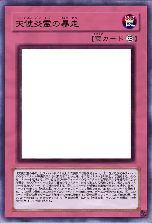 | 「天使炎霊の暴走」はフィールドに1枚しか表側表示で存在できない。①:自分及び相手フィールドのモンスターが守備表示から攻撃表示になった時、そのモンスターを対象として発動する。そのモンスターを破壊する。②:自分及び相手フィールドのモンスターが攻撃表示から守備表示になった場合、そのプレイヤーは自分の墓地のモンスター1体を対象として発動できる。選択したモンスターを自身のフィールドに特殊召喚する。③:このカードが破壊され墓地へ送られた場合、自分フィールドの全ての「天使炎霊」モンスターをリリースして発動できる。墓地のこのカードを発動する。この効果で発動したこのカードがフィールドから離れた時、ゲームから除外される。④:このカードが③の効果でゲームから除外された時に発動する。③の効果でリリースした「天使炎霊」モンスターの数まで、自分のデッキから「堕天使炎霊」以外の「天使炎霊」モンスターを選び、召喚条件を無 | |||