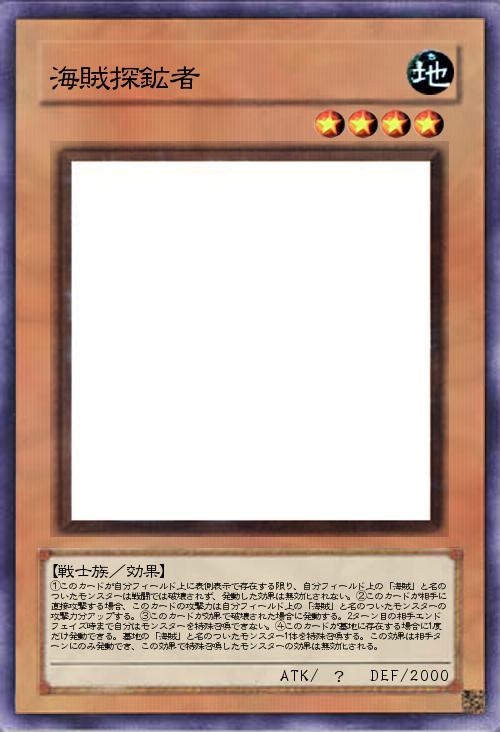 | ①このカードが自分フィールド上に表側表示で存在する限り、自分フィールド上の「海賊」と名のついたモンスターは戦闘では破壊されず、発動した効果は無効化されない。②このカードが相手に直接攻撃する場合、このカードの攻撃力は自分フィールド上の「海賊」と名のついたモンスターの攻撃力分アップする。③このカードが効果で破壊された場合に発動する。2ターン目の相手エンドフェイズ時まで自分はモンスターを特殊召喚できない。④このカードが墓地に存在する場合に1度だけ発動できる。墓地の「海賊」と名のついたモンスター1体を特殊召喚する。この効果は相手ターンにのみ発動でき、この効果で特殊召喚したモンスターの効果は無効化される。 | |||