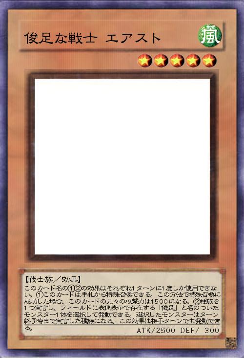 | このカード名の①②の効果はそれぞれ1ターンに1度しか使用できない。①このカードは手札から特殊召喚できる。この方法で特殊召喚に成功した場合、このカードの元々の攻撃力は1500になる。②種族を1つ宣言し、フィールドに表側表示で存在する「俊足」と名のついたモンスター1体を選択して発動できる。選択したモンスターはターン終了時まで宣言した種族になる。この効果は相手ターンでも発動できる。 | |||