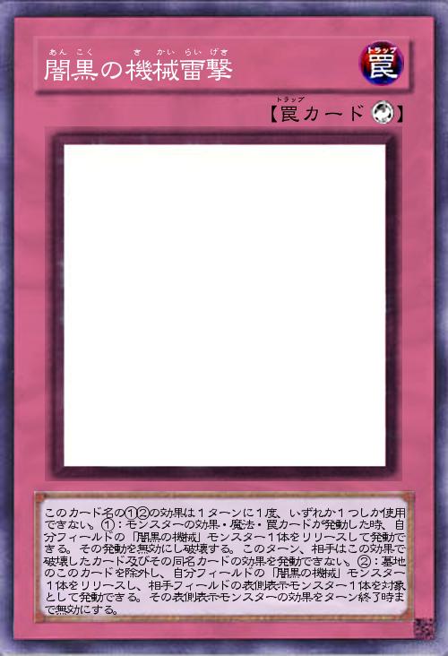 | このカード名の①②の効果は1ターンに1度、いずれか1つしか使用できない。①:モンスターの効果・魔法・罠カードが発動した時、自分フィールドの「闇黒の機械」モンスター1体をリリースして発動できる。その発動を無効にし破壊する。このターン、相手はこの効果で破壊したカード及びその同名カードの効果を発動できない。②:墓地のこのカードを除外し、自分フィールドの「闇黒の機械」モンスター1体をリリースし、相手フィールドの表側表示モンスター1体を対象として発動できる。その表側表示モンスターの効果をターン終了時まで無効にする。 | |||