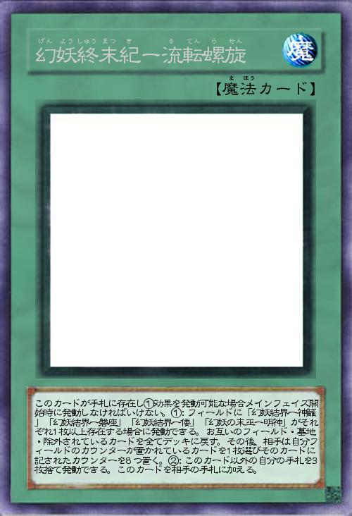 | このカードが手札に存在し①効果を発動可能な場合メインフェイズ開始時に発動しなければいけない。①:フィールドに「幻妖結界ー神籬」「幻妖結界ー磐座」「幻妖結界ー倭」「幻妖の末巫ー明神」がそれぞれ1枚以上存在する場合に発動できる。お互いのフィールド・墓地・除外されているカードを全てデッキに戻す。その後、相手は自分フィールドのカウンターが置かれているカードを1枚選びそのカードに記されたカウンターを8つ置く。②:このカード以外の自分の手札を3枚捨て発動できる。このカードを相手の手札に加える。 | |||
