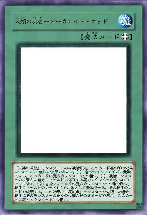 | 「人類の希望」モンスターにのみ装備可能。このカード名の①の効果は1ターンに1度しか使用できない。①:自分メインフェイズに発動できる。このカードに魔力カウンターを2つ置く。②:装備モンスターの攻撃力は自分フィールドに存在する魔力カウンターの数×400アップする。③:自分フィールドの魔力カウンターを1つ取り除き、相手フィールドのカード1枚を対象として発動できる。その相手のカードを破壊する。この効果で「反逆魚」モンスターを破壊した場合、相手にそのモンスターの元々の攻撃力分のダメージを与え、このカードに魔力カウンターを3つ置く。 | |||