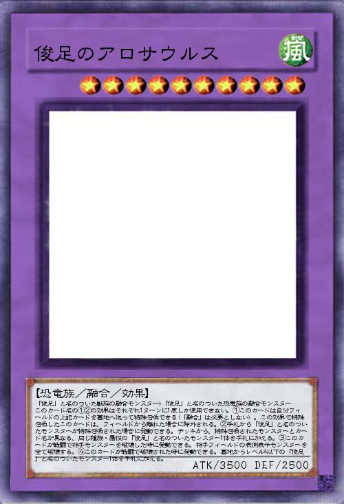 | 「俊足」と名のついた獣族の融合モンスター+「俊足」と名のついた恐竜族の融合モンスター このカード名の①②の効果はそれぞれ1ターンに1度しか使用できない。①このカードは自分フィールドの上記カードを墓地へ送って特殊召喚できる(「融合」は必要としない)。この効果で特殊召喚したこのカードは、フィールドから離れた場合に除外される。②手札から「俊足」と名のついたモンスターが特殊召喚された場合に発動できる。デッキから、特殊召喚されたモンスターとカード名が異なる、同じ種族・属性の「俊足」と名のついたモンスター1体を手札に加える。③このカードが戦闘で相手モンスターを破壊した時に発動できる。相手フィールドの表側表示モンスターを全て破壊する。④このカードが戦闘で破壊された時に発動できる。墓地からレベル4以下の「俊足」と名のついたモンスター1体を手札に加える。 | |||