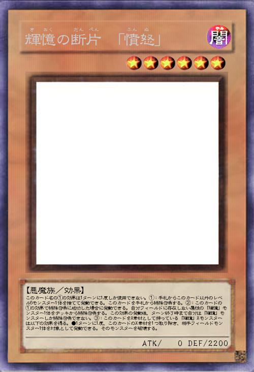 | このカード名の①の効果は1ターンに1度しか使用できない。①:手札からこのカード以外のレベル6モンスター1体を捨てて発動できる。このカードを手札から特殊召喚する。②:このカードの①の効果で特殊召喚に成功した場合に発動できる。自分フィールドに存在しない属性の「輝憶」モンスター1体をデッキから特殊召喚する。この効果の発動後、ターン終了時まで自分は「輝憶」モンスターしか特殊召喚できない。③:このカードをX素材として持っている「輝憶」Xモンスターは以下の効果を得る。●1ターンに1度、このカードのX素材を1つ取り除き、相手フィールドモンスター1体を対象として発動できる。そのモンスターを破壊する。 | |||