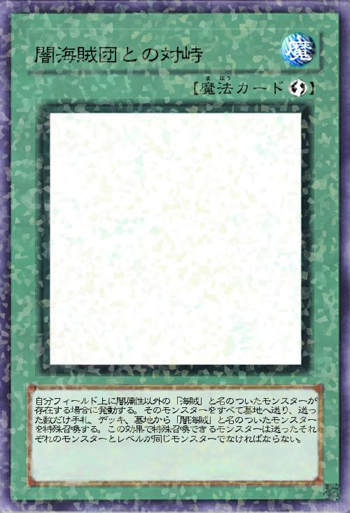 | 自分フィールド上に闇属性以外の「海賊」と名のついたモンスターが存在する場合に発動する。そのモンスターをすべて墓地へ送り、送った数だけ手札、デッキ、墓地から「闇海賊」と名のついたモンスターを特殊召喚する。この効果で特殊召喚できるモンスターは送ったそれぞれのモンスターとレベルが同じモンスターでなければならない。 | |||